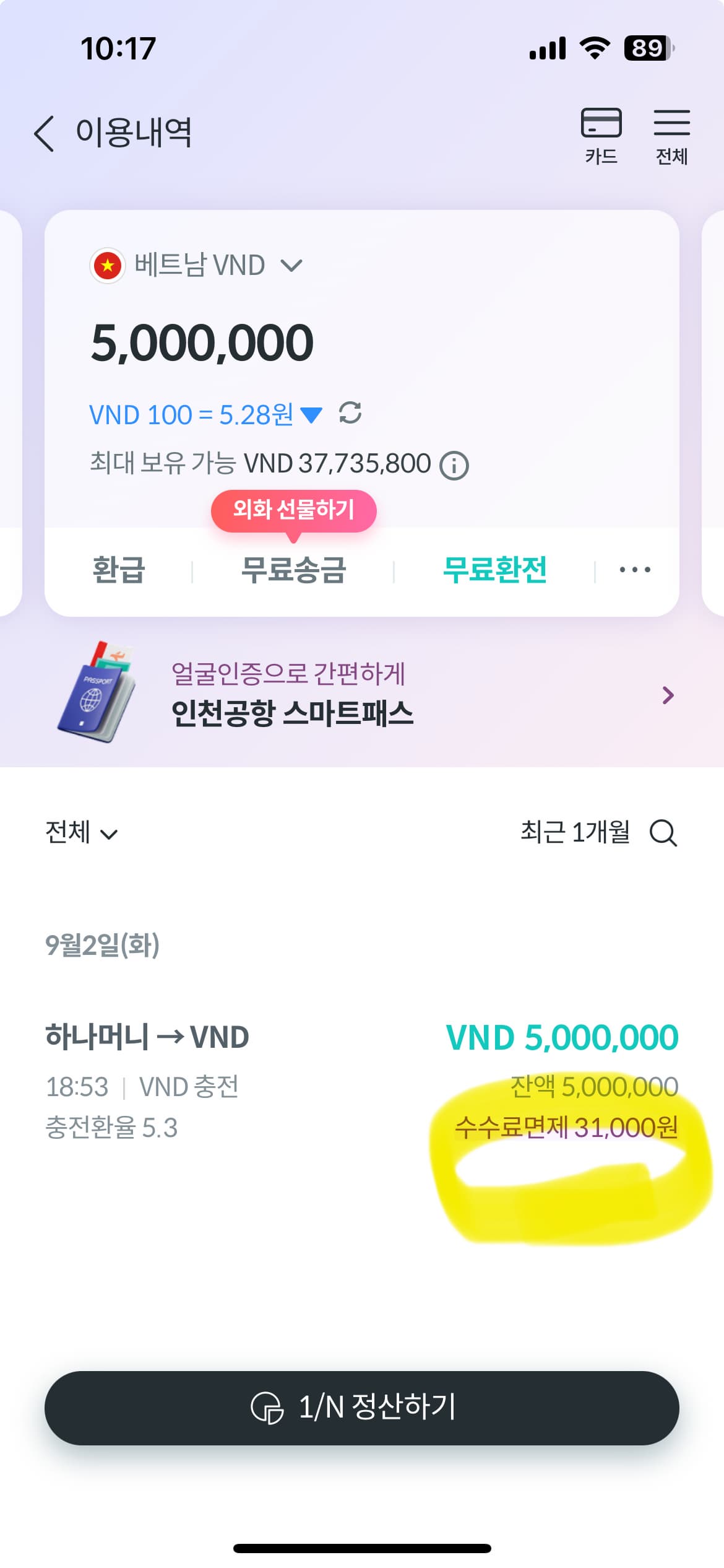 하나머니 앱을 깔아서 한화(KRW)를 충전한 뒤 앱에서 바로 베트남 동(VND)로 환전했습니다. 수수료 면제 혜택을 31,000원 받았고, 해외 atm 기기에서 수수료 없이 외화를 출금하고, 현지 마트에서 결제할 때도 수수료 무료 혜택을 받았습니다.