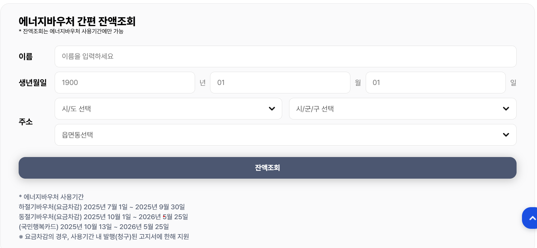 2025년 에너지 바우처 잔액은고지서 상에서 직접 확인하실 수 있고,에너지바우처 공식 홈페이지(복지로 또는 한국에너지공단 연계)에서도 확인 가능합니다. 또한,주민센터를 방문하시면 현장 조회도 가능하니, 정기적으로 확인하면서 효율적으로 사용해 보시는 걸 추천합니다.